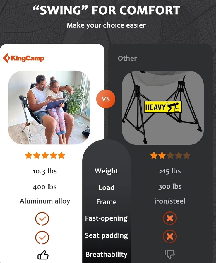 屋外キャンプチェアは37.8 "x27.1" x49.2 "で、無制限の周りに小刻みに動くための広々としたシートエリアがあり、高いバックレストは背中を完全にサポートできます。地面から22.8"で、ロッキングキャンプの椅子は大人に伸びるのに最適です自由に足。